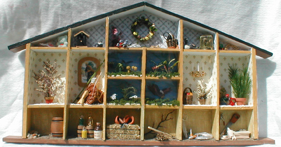 This house filled with rooms: each decorated individually with small household items. Dimensions:16 ½” x 12” x 2”. Cost $120.00